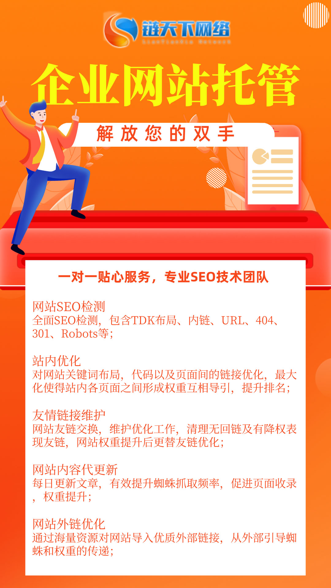 鏈天下是一家專業(yè)的網(wǎng)站代維修和更新公司,我們致力于為客戶提供優(yōu)質(zhì)、快速的網(wǎng)站服務,幫助其保持網(wǎng)站的正常運行和持續(xù)發(fā)展。通過我們的專業(yè)團隊和先進技術,您可以放心將網(wǎng)站的維護和更新工作交給我們。